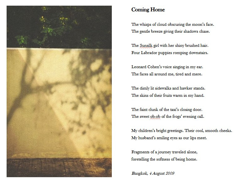 I wrote this poem a long time ago. It feels like another life - I was a young mother, struggling to hold onto myself. I moved through Bangkok invisible, through crowded shopping malls, past giant video screens, travelling on the elevated railway and in taxis back to the dark, quiet pockets of the city where people live away from the urban noise, and where nature still thrives. Herein lies the softness of family and home.